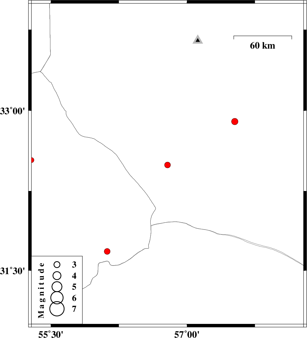 | 2016/12/22 | 04:25:51.4 | 07:55:51.4 | 32.899 | 57.528 | 8 | ML3.3 | Yazd Province, 96 km South-East of Tabas | ||