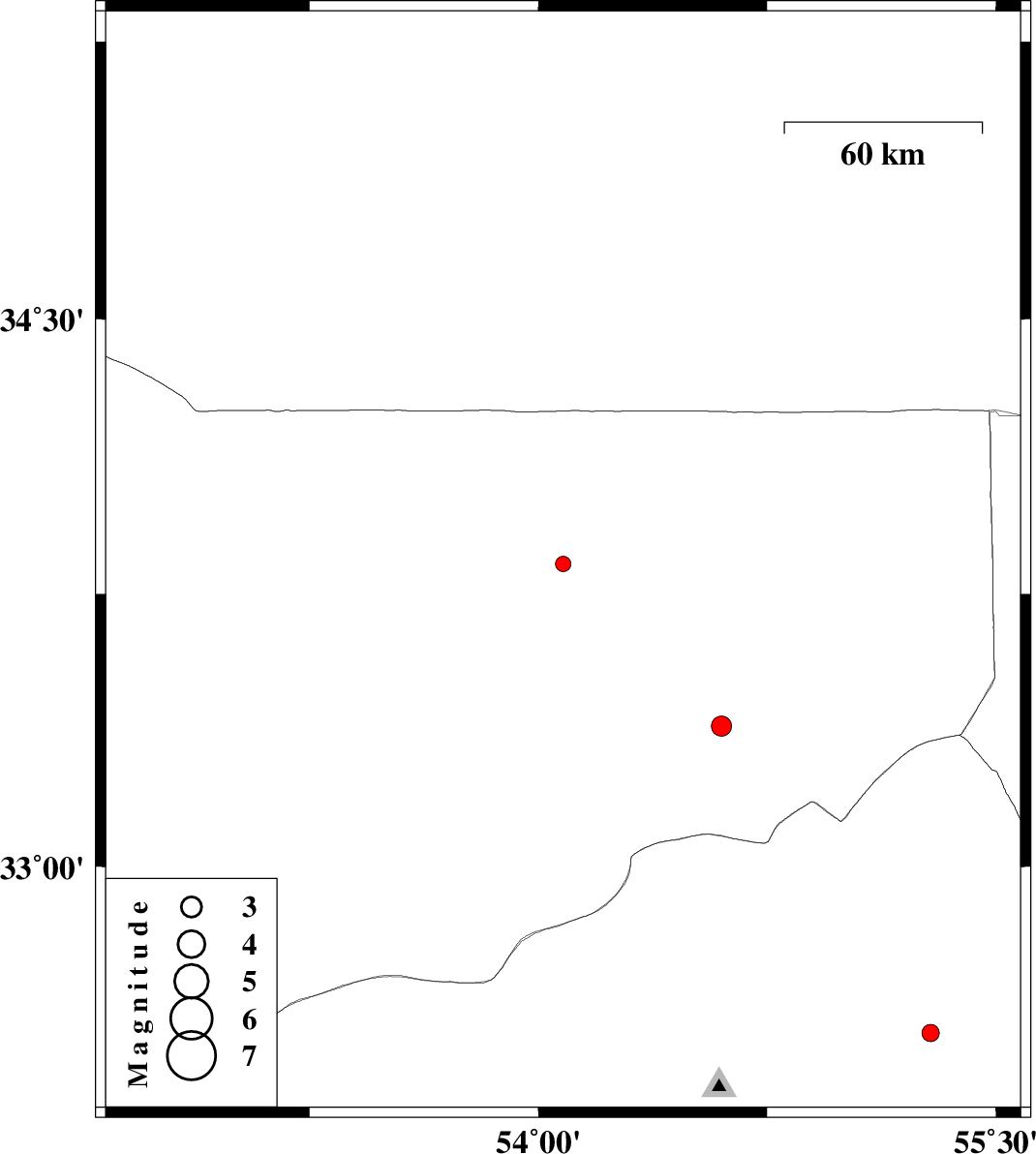 | 2016/11/29 | 03:23:28.7 | 06:53:28.7 | 33.388 | 54.6 | 14 | ML2.9 | Esfahan Province, 131 km North-East of Ardakan |