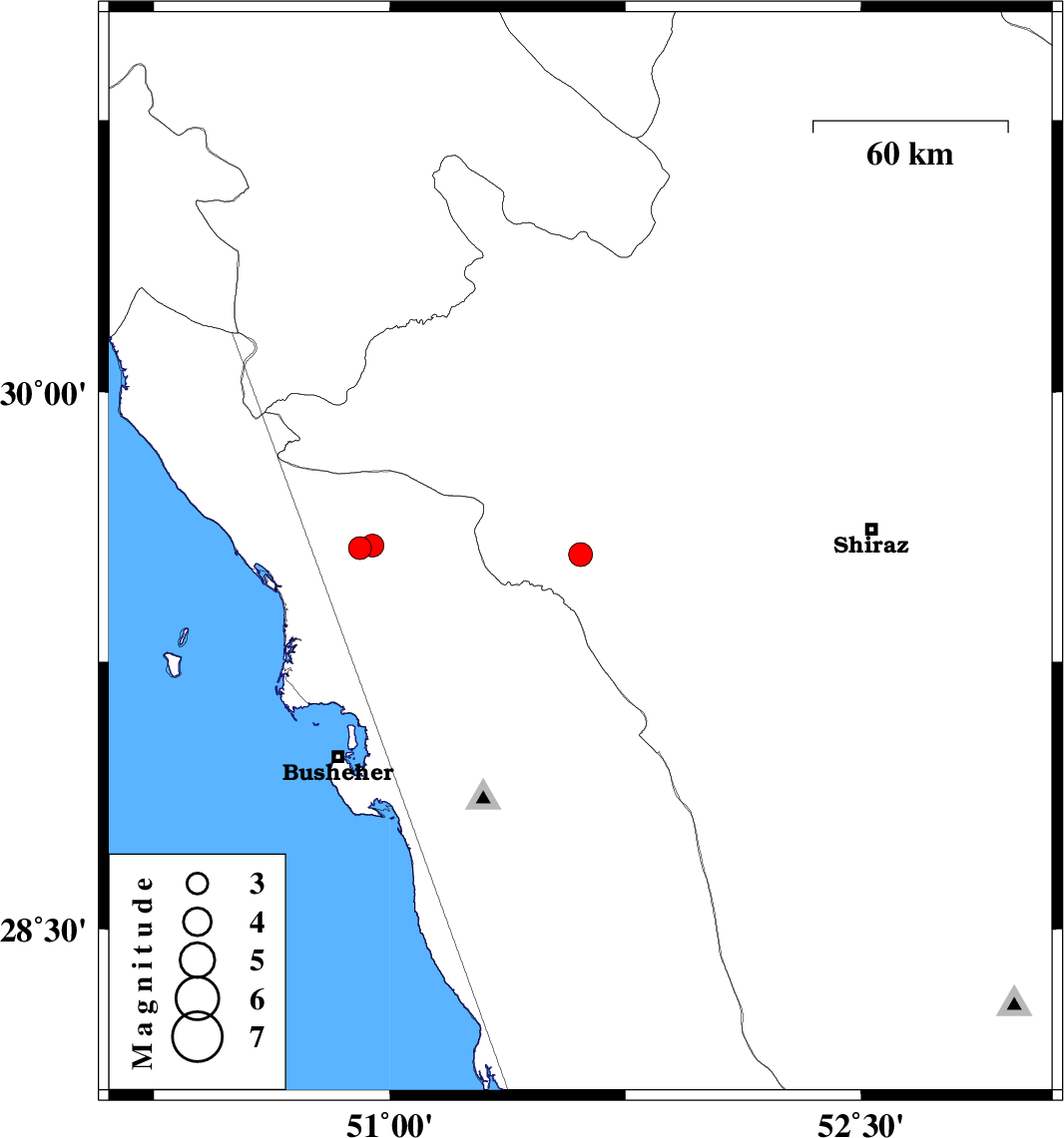 | 2016/12/29 | 13:24:08.3 | 16:54:08.3 | 29.548 | 51.607 | 23 | ML3.4 | Fars Province, 9 km of Kazerun | ||