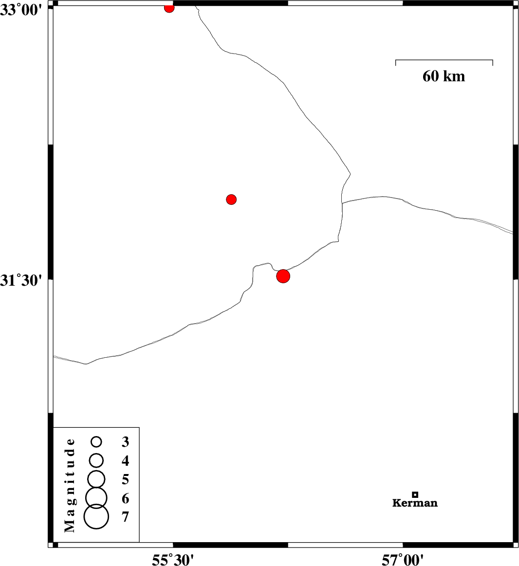 | 2017/01/09 | 09:25:43.2 | 12:55:43.2 | 31.518 | 56.218 | 15 | ML3.9 | Kerman Province, 63 km North-West of Ravar | ||