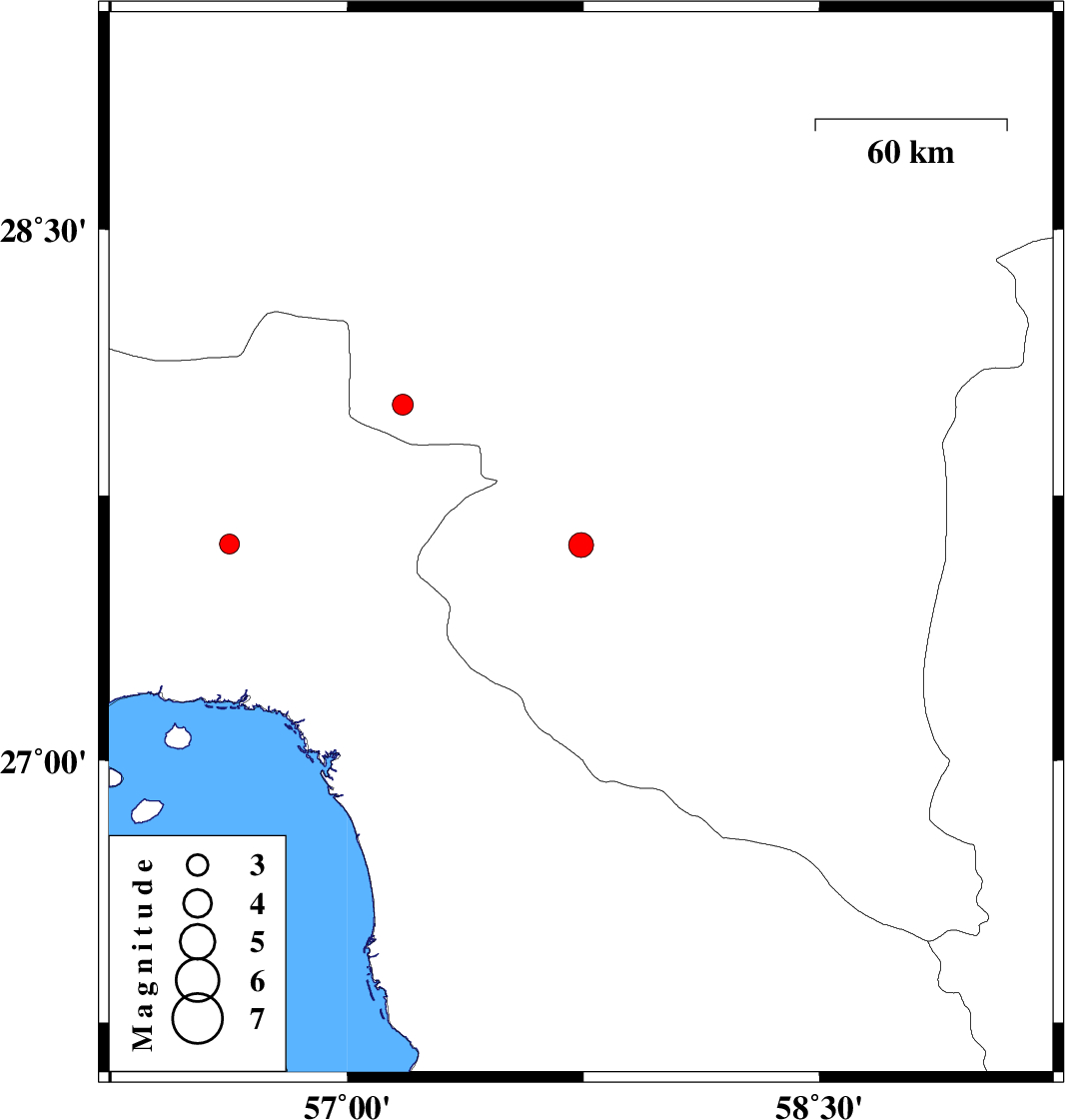 | 2017/01/13 | 10:07:21.3 | 13:37:21.3 | 27.61 | 57.742 | 14 | ML3.5 | Kerman Province, 38 km South of Kahnuj | ||