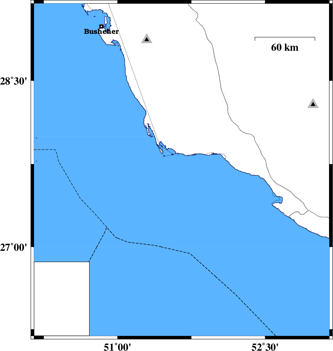 | 2017/01/14 | 11:33:20.0 | 15:03:20.0 | 27.69 | 51.652 | 14 | ML2.6 | Persian Gulf, 43 km South-West of Bandar-e kangan |