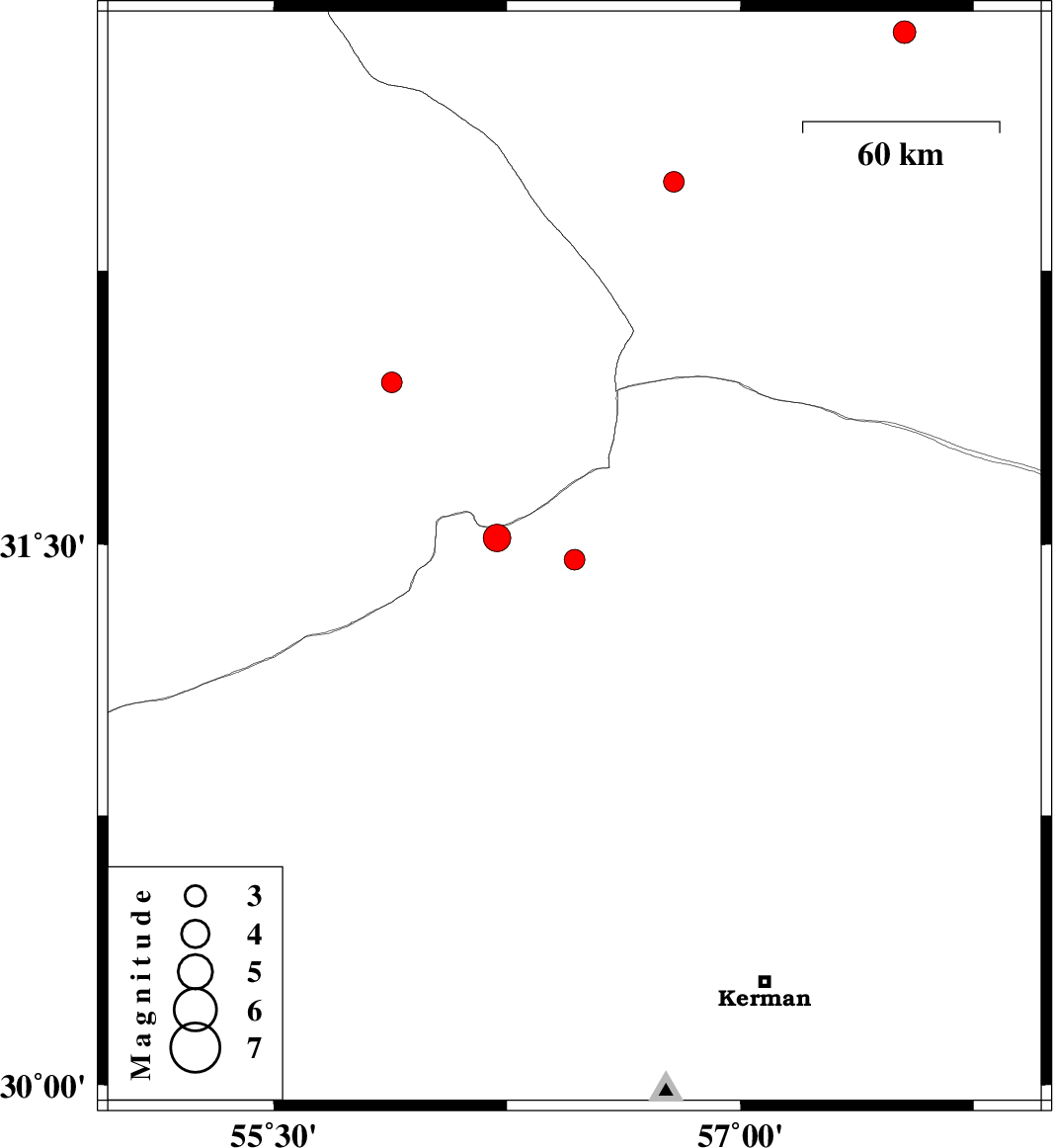 | 2017/01/09 | 09:25:43.2 | 12:55:43.2 | 31.518 | 56.218 | 15 | ML3.9 | Kerman Province, 63 km North-West of Ravar | ||