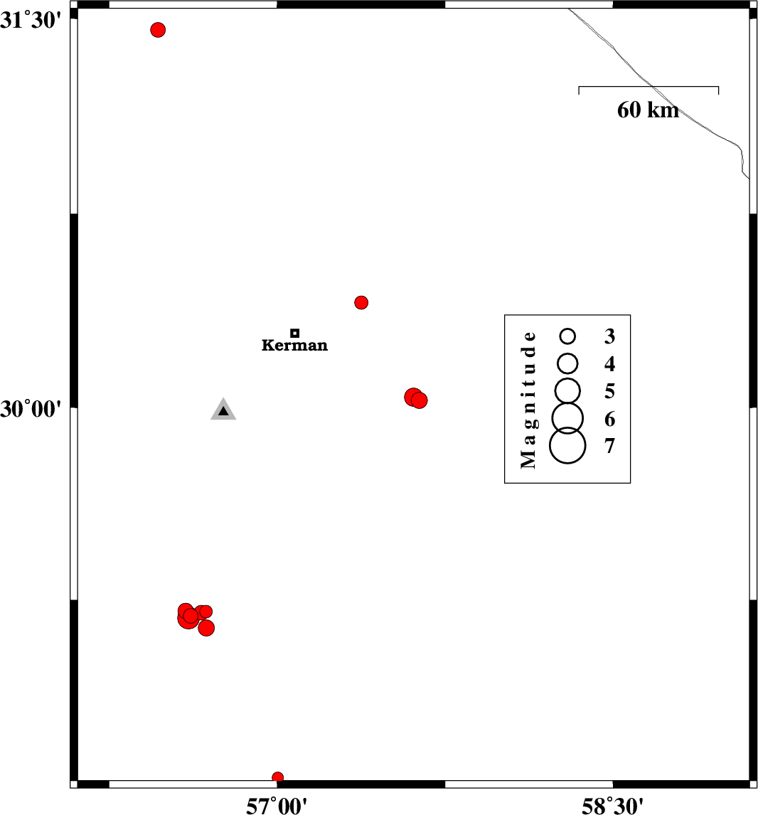 2017/01/26 05:54:37.9 09:24:37.9 30.0457.60914 ML3.6 Kerman Province, 58 km South-East of Kerman