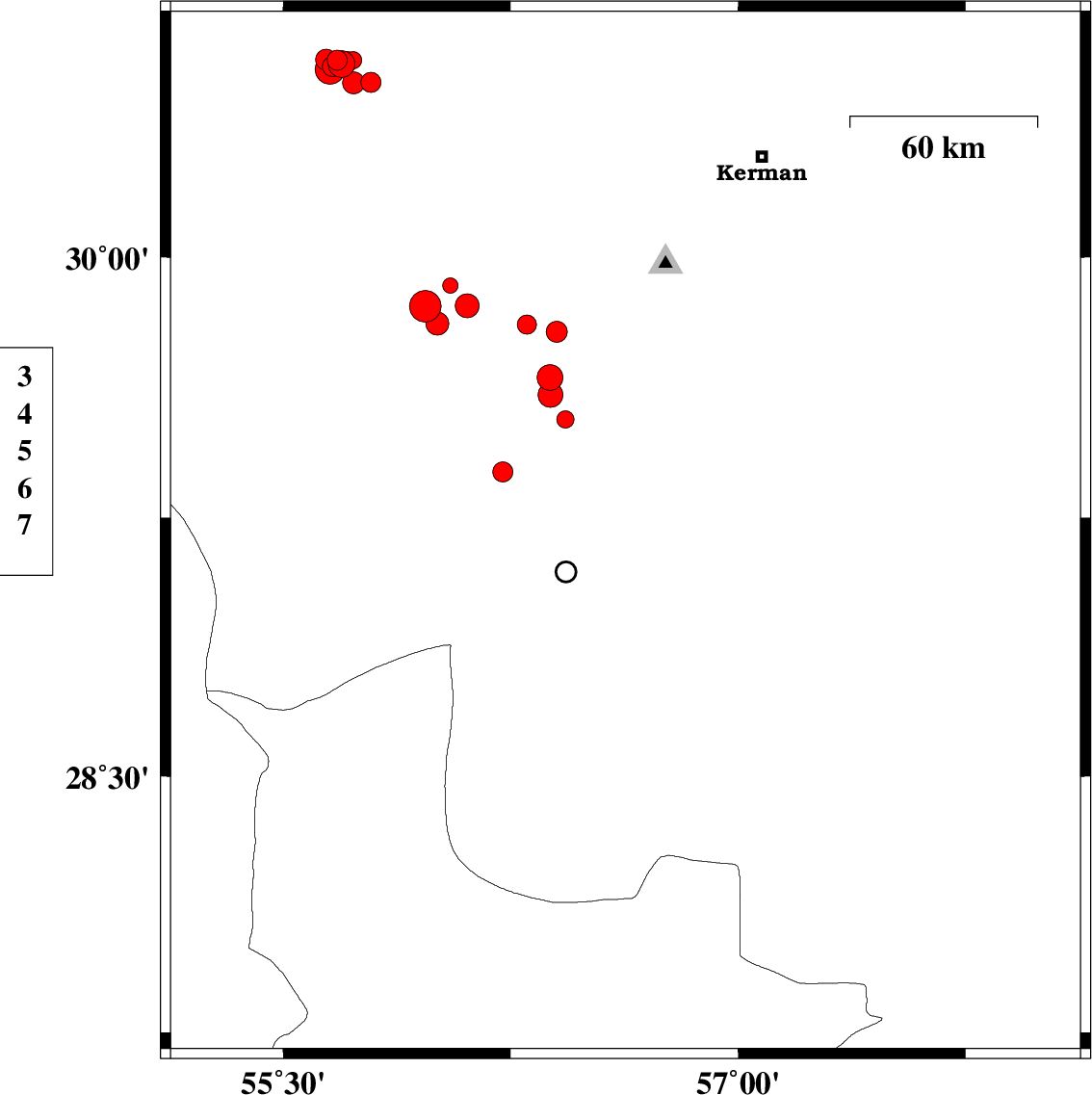 |  | 2017/01/26 | 05:54:37.9 | 09:24:37.9 | 30.04 | 57.609 | 14 | ML3.6 | Kerman Province, 58 km South-East of Kerman |  |