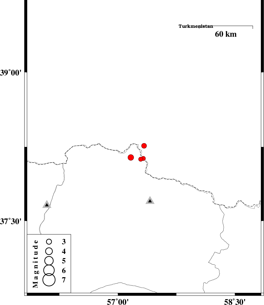 | 2017/01/28 | 12:56:10.8 | 16:26:10.8 | 38.127 | 57.293 | 17 | ML2.6 | Khorasan(north) Province, 73 km North of Bojnurd | ||
