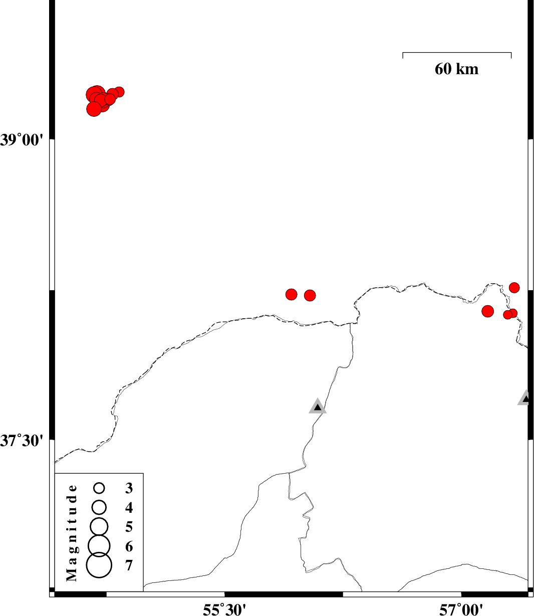 | 2017/01/28 | 12:56:10.8 | 16:26:10.8 | 38.127 | 57.293 | 17 | ML2.6 | Khorasan(north) Province, 73 km North of Bojnurd | ||