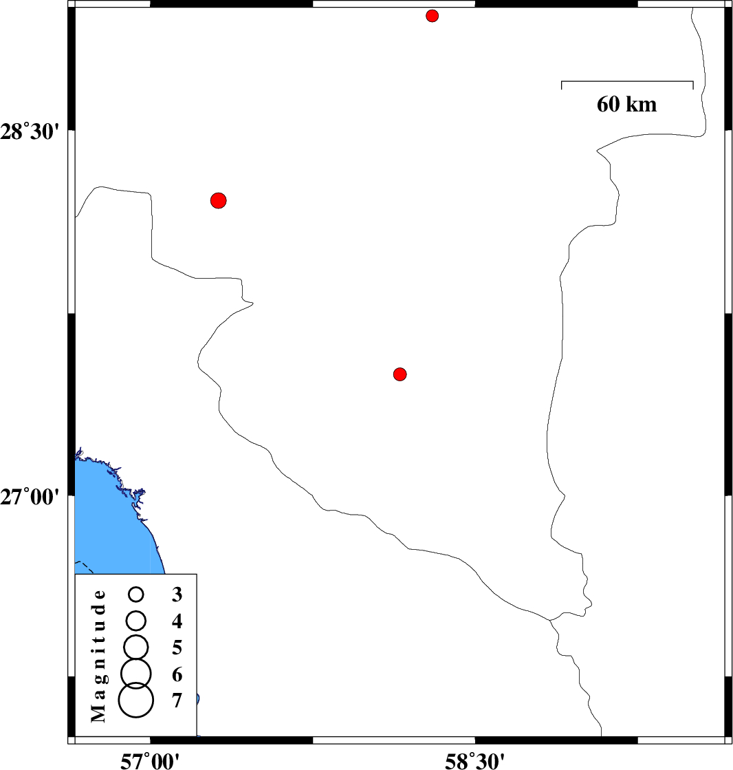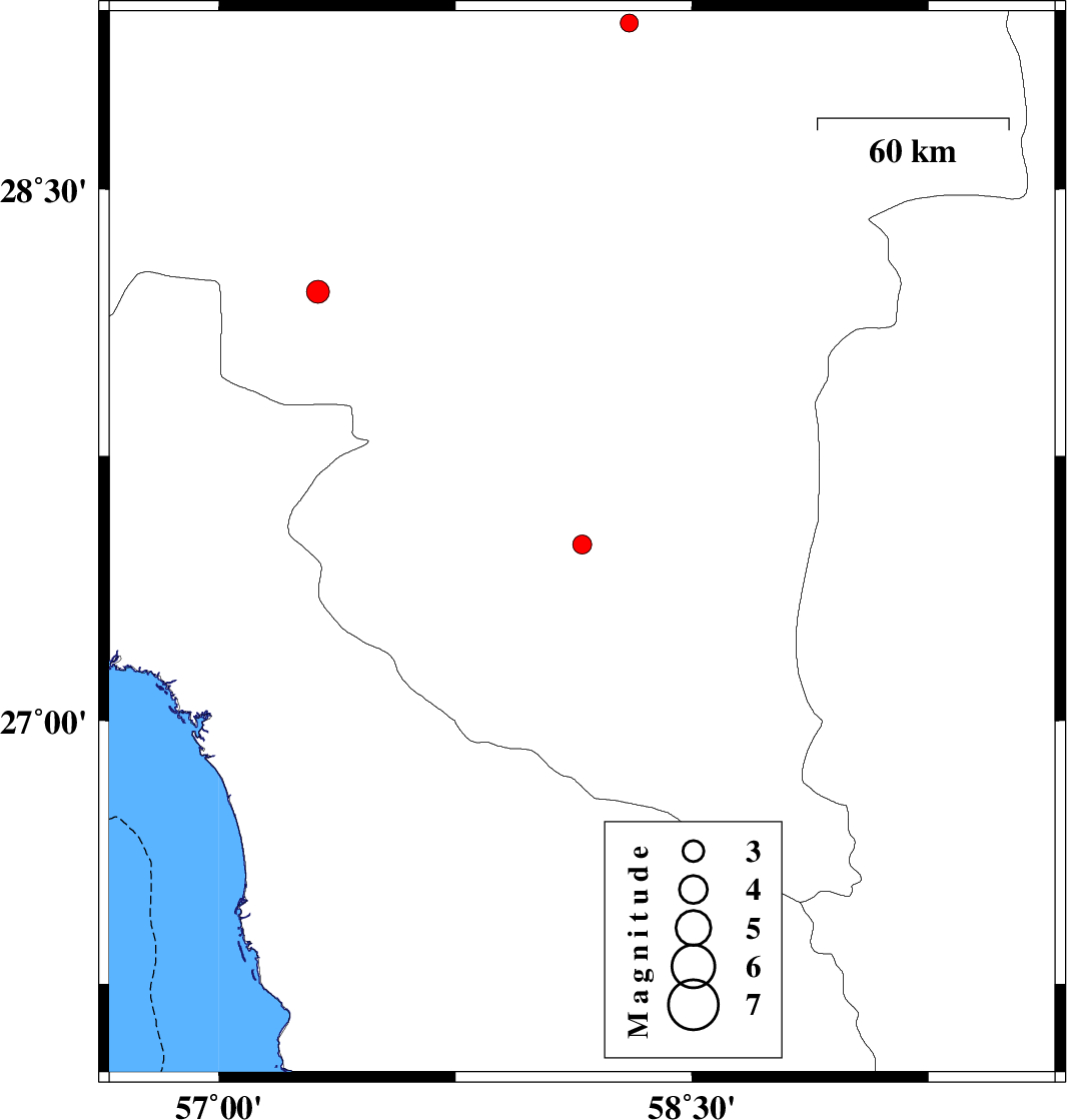 | 2017/02/04 | 06:17:16.2 | 09:47:16.2 | 28.212 | 57.314 | 15 | ML3.3 | Kerman Province, 47 km North-West of Kahnuj |