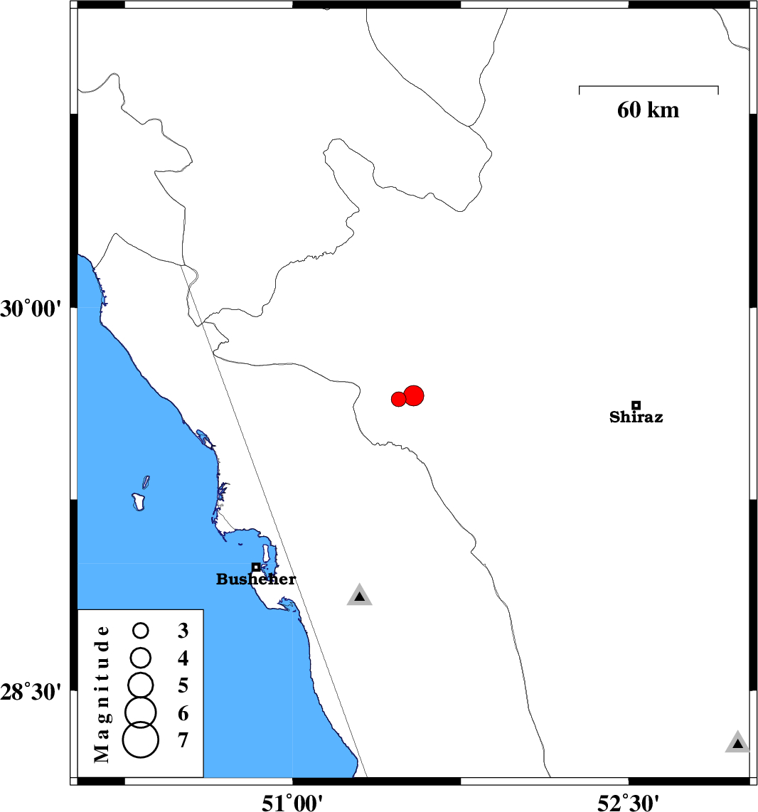 | 2017/02/15 | 15:37:25.7 | 19:07:25.7 | 29.656 | 51.539 | 15 | ML4.1 | Fars Province, 12 km -West of Kazerun |