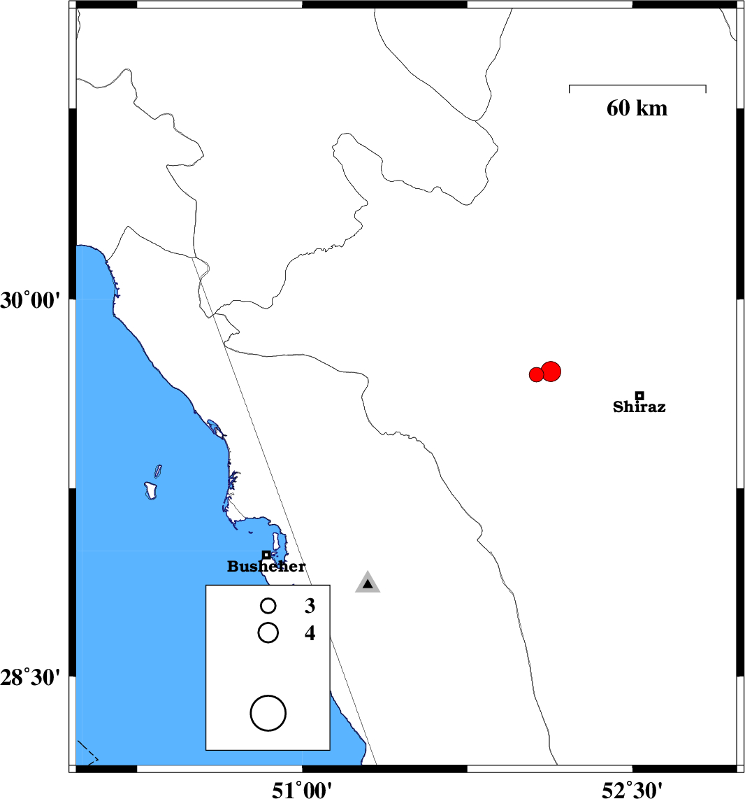 | 2017/02/15 | 15:37:25.7 | 19:07:25.7 | 29.656 | 51.539 | 15 | ML4.1 | Fars Province, 12 km -West of Kazerun |