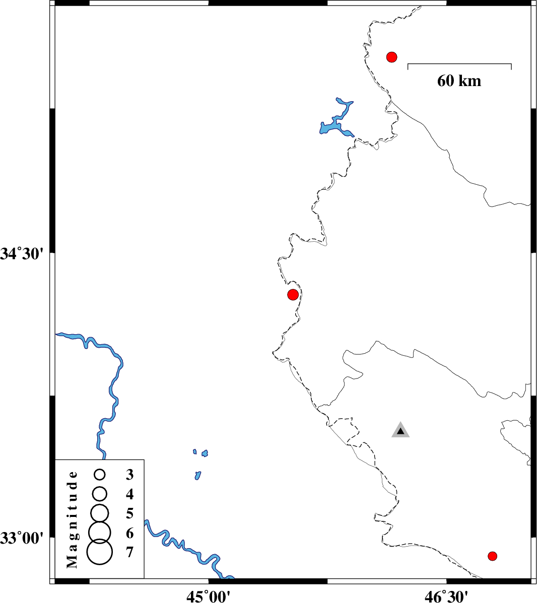 | 2017/02/24 | 00:37:36.7 | 04:07:36.7 | 34.281 | 45.532 | 14 | ML3.1 | Iraq, 27 km South of Qasr-E-Shirin | ||