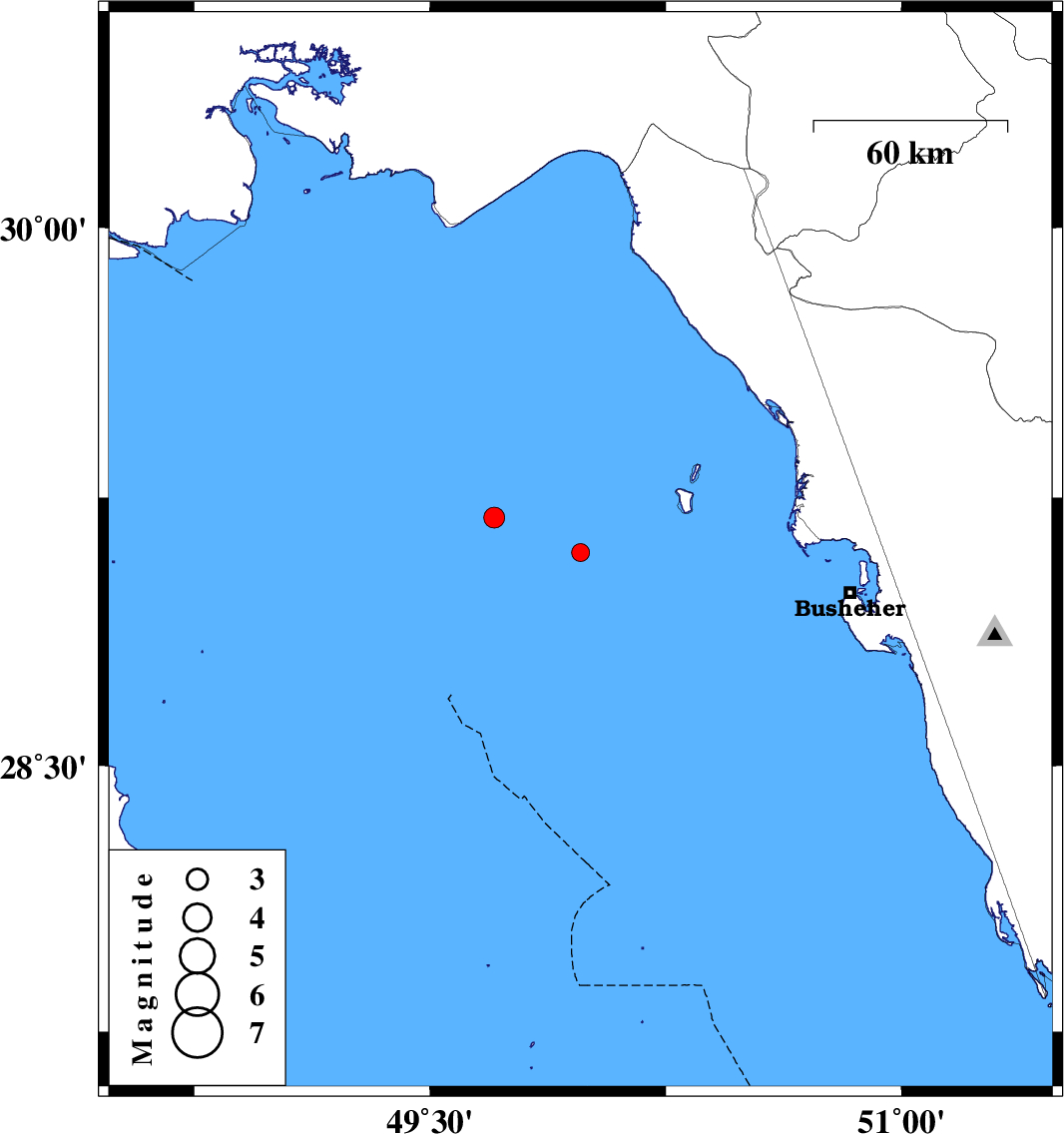 | 2017/02/27 | 22:01:22.7 | 01:31:22.7 | 29.097 | 49.979 | 16 | ML2.6 | Persian Gulf, 84 km North-West of Busheher | ||