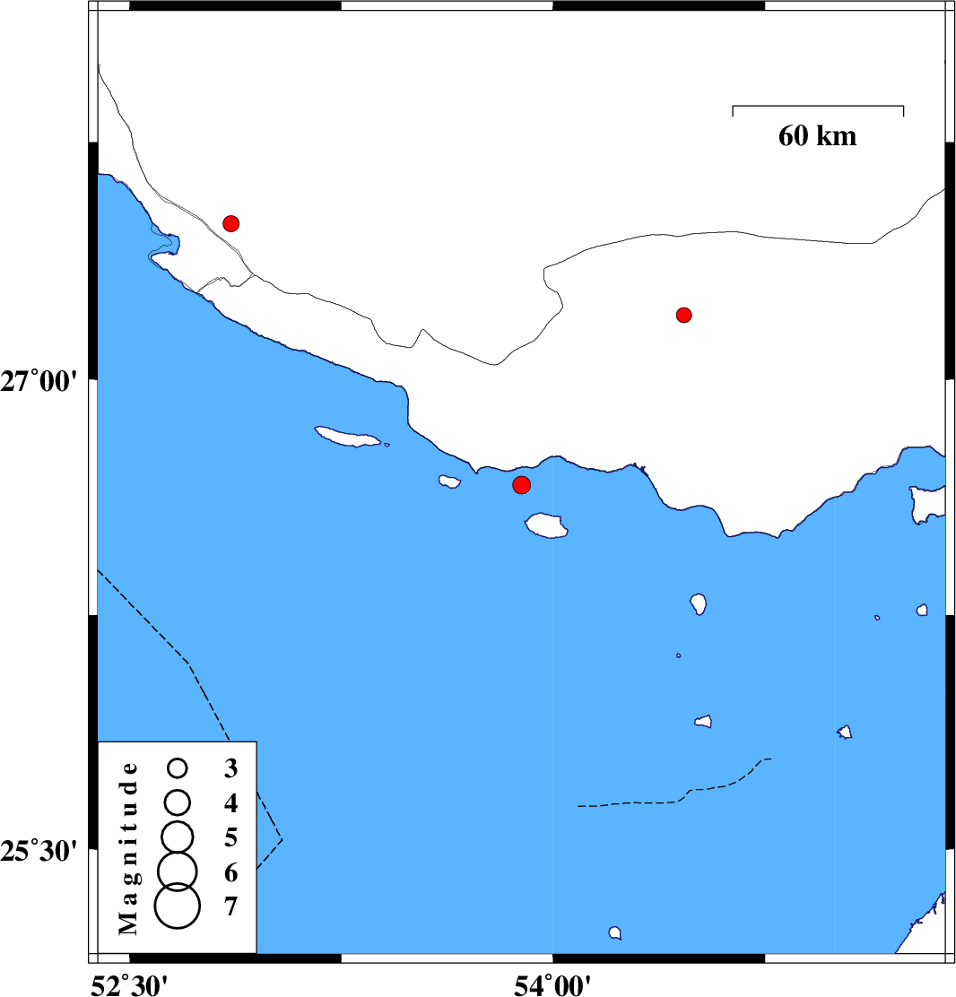 | 2017/03/05 | 14:50:23.5 | 18:20:23.5 | 26.664 | 53.888 | 14 | ML2.8 | Persian Gulf, 76 km South-West of Bastak | ||