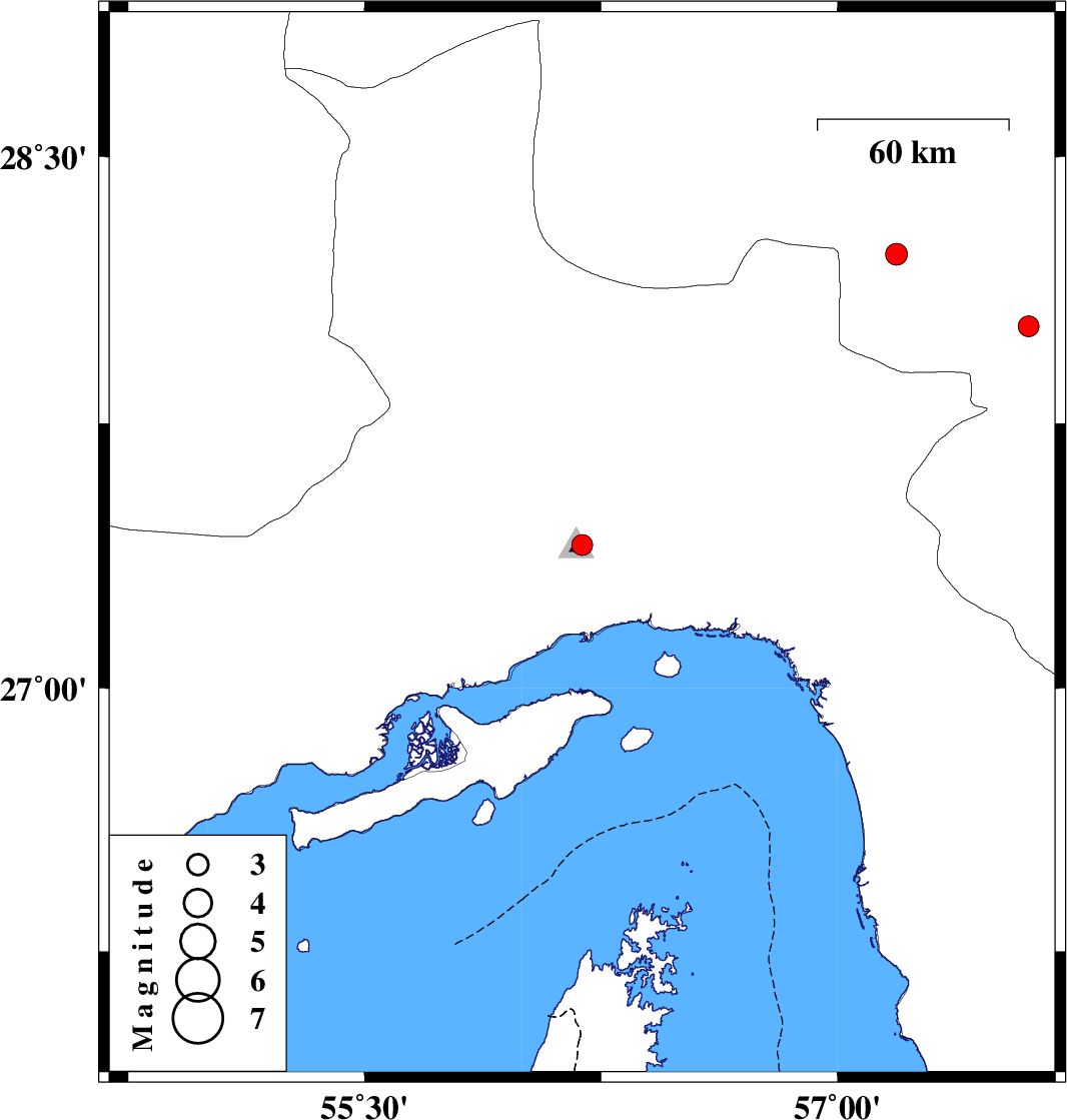 | 2017/03/08 | 05:00:11.1 | 08:30:11.1 | 28.227 | 57.187 | 16 | ML3.1 | Kerman Province, 59 km North-West of Kahnuj |