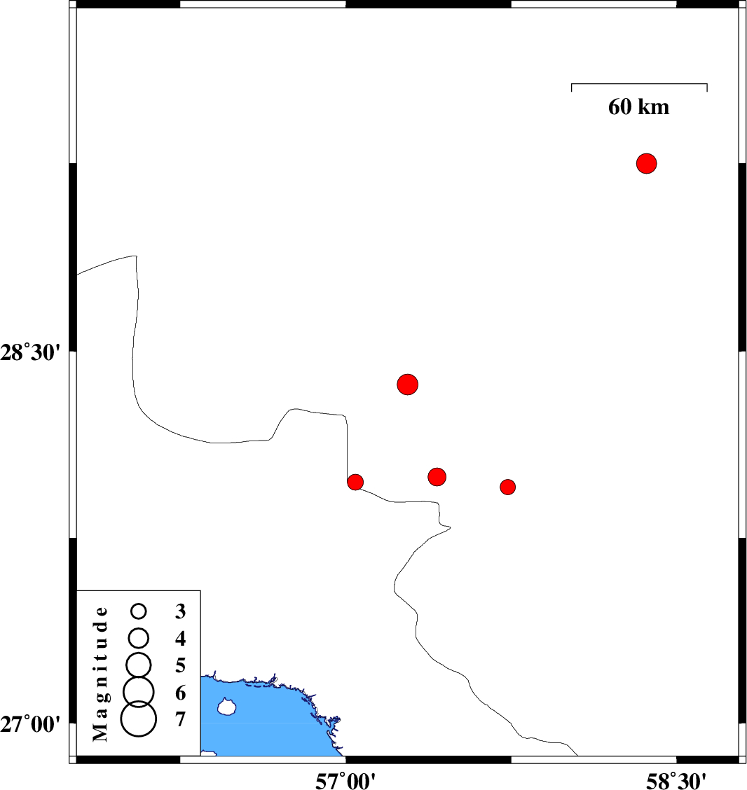 | 2017/03/20 | 23:44:47.2 | 03:14:47.2 | 27.974 | 57.044 | 14 | ML3.2 | Kerman Province, 64 km -West of Kahnuj | ||