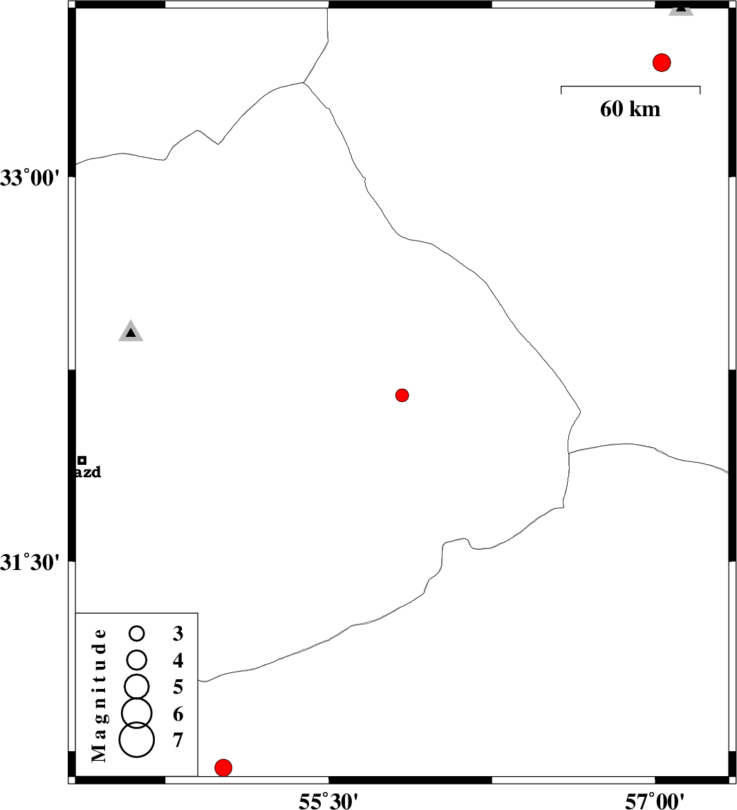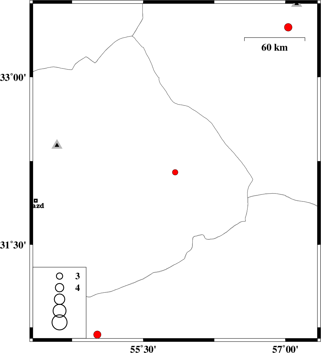 | 2017/04/08 | 10:46:05.3 | 15:16:05.3 | 33.44 | 57.029 | 8 | ML3.6 | Yazd Province, 20 km South-East of Tabas | ||