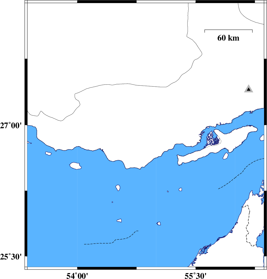 | 2017/04/13 | 19:01:36.7 | 23:31:36.7 | 27.186 | 54.231 | 18 | ML2.7 | Hormozgan Province, 13 km -West of Bastak |