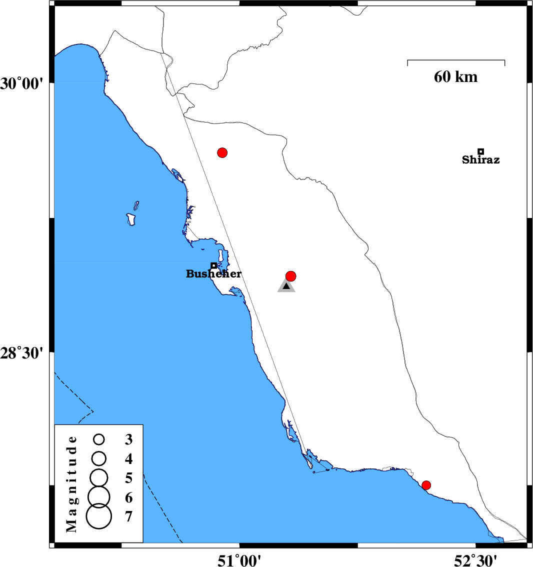| 2017/04/18 | 01:28:48.8 | 05:58:48.8 | 29.612 | 50.891 | 18 | ML2.8 | Bushehr Province, 37 km -East of Bandar-e genaveh |