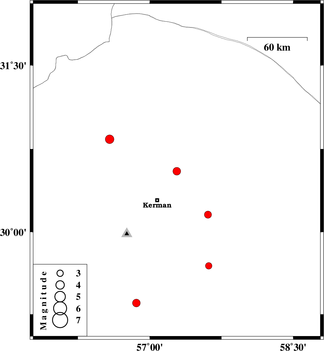 | 2017/04/06 | 12:09:42.8 | 16:39:42.8 | 30.157 | 57.609 | 14 | ML3.4 | Kerman Province, 53 km South-East of Kerman | ||