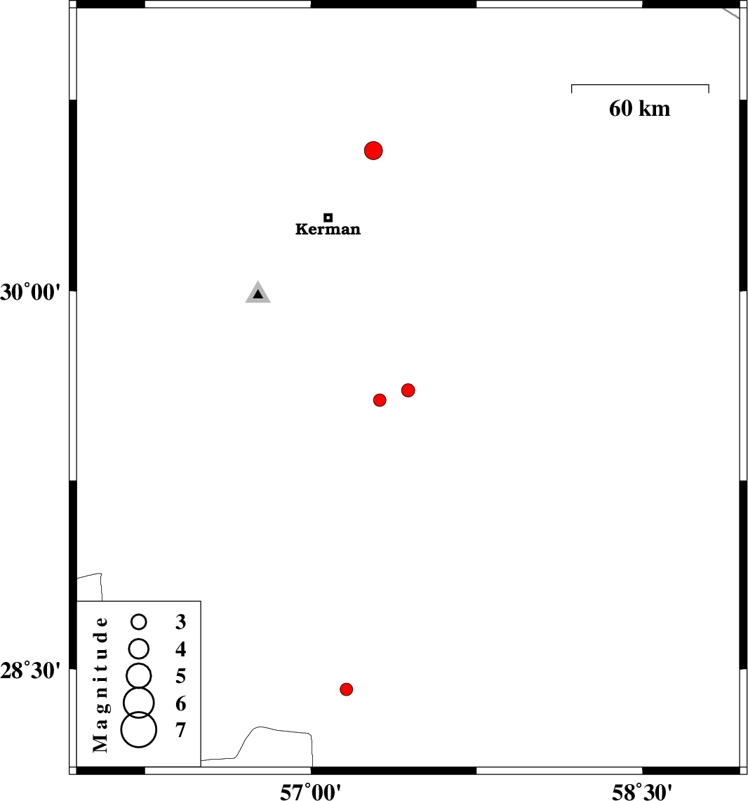 | 2017/04/20 | 05:40:16.7 | 10:10:16.7 | 30.55 | 57.283 | 15 | ML3.6 | Kerman Province, 35 km North-East of Kerman | ||