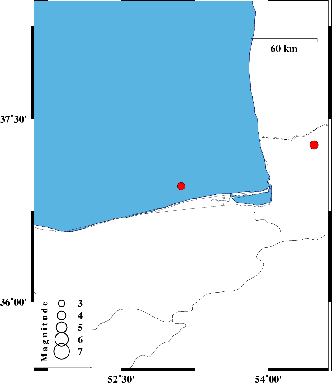 | 2017/04/24 | 11:09:12.2 | 15:39:12.2 | 36.95 | 53.111 | 14 | ML3.5 | Caspian Sea, 44 km North of Sari | ||