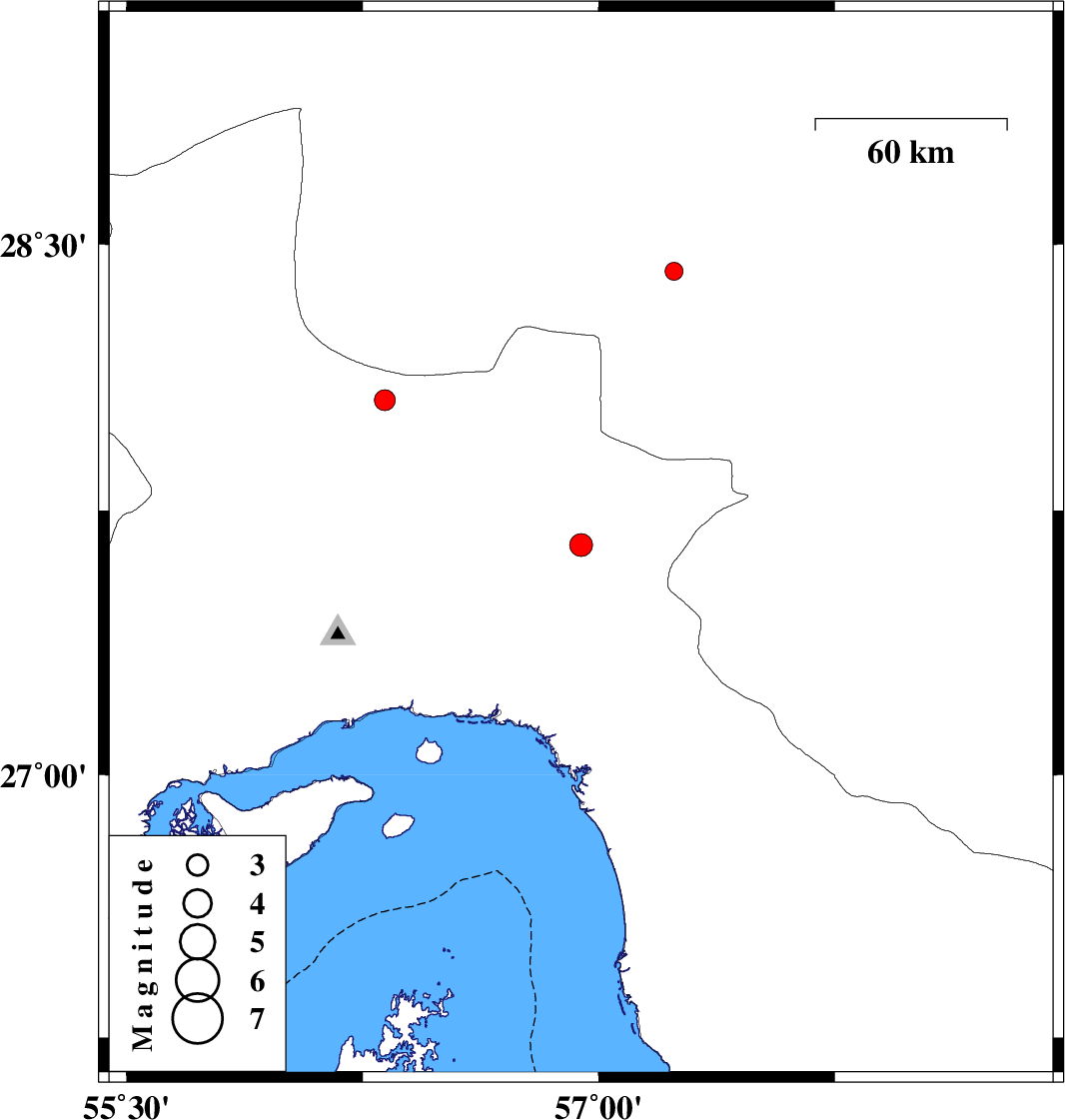 | 2017/04/28 | 05:07:08.3 | 09:37:08.3 | 27.652 | 56.944 | 14 | ML3.2 | Hormozgan Province, 38 km North-West of Dehbarez | ||