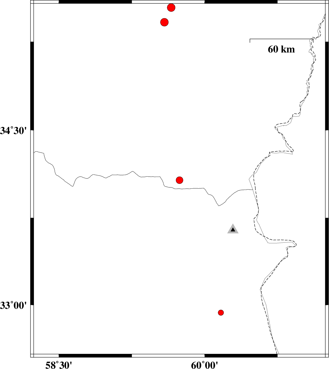 | 2017/04/29 | 10:13:29.6 | 14:43:29.6 | 32.933 | 60.167 | 14 | ML2.5 | Khorasan(south) Province, 49 km North-East of Sarbisheh | ||