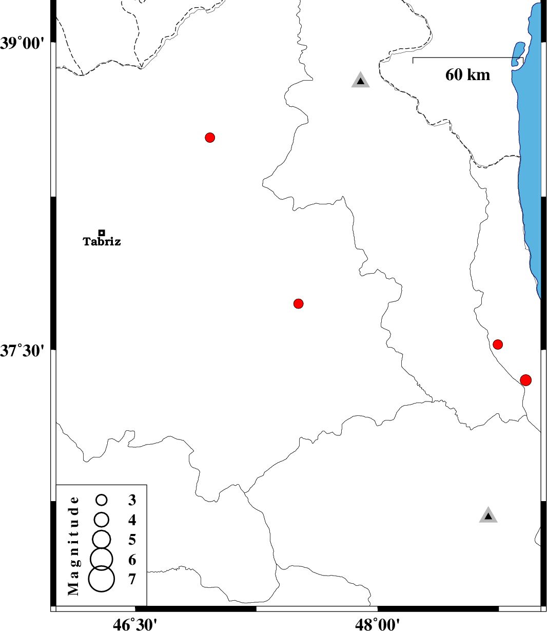 | 2017/04/29 | 10:14:22.4 | 14:44:22.4 | 38.537 | 46.963 | 14 | ML2.7 | Azarbaijan Sharghi Province, 12 km -West of Ahar | ||