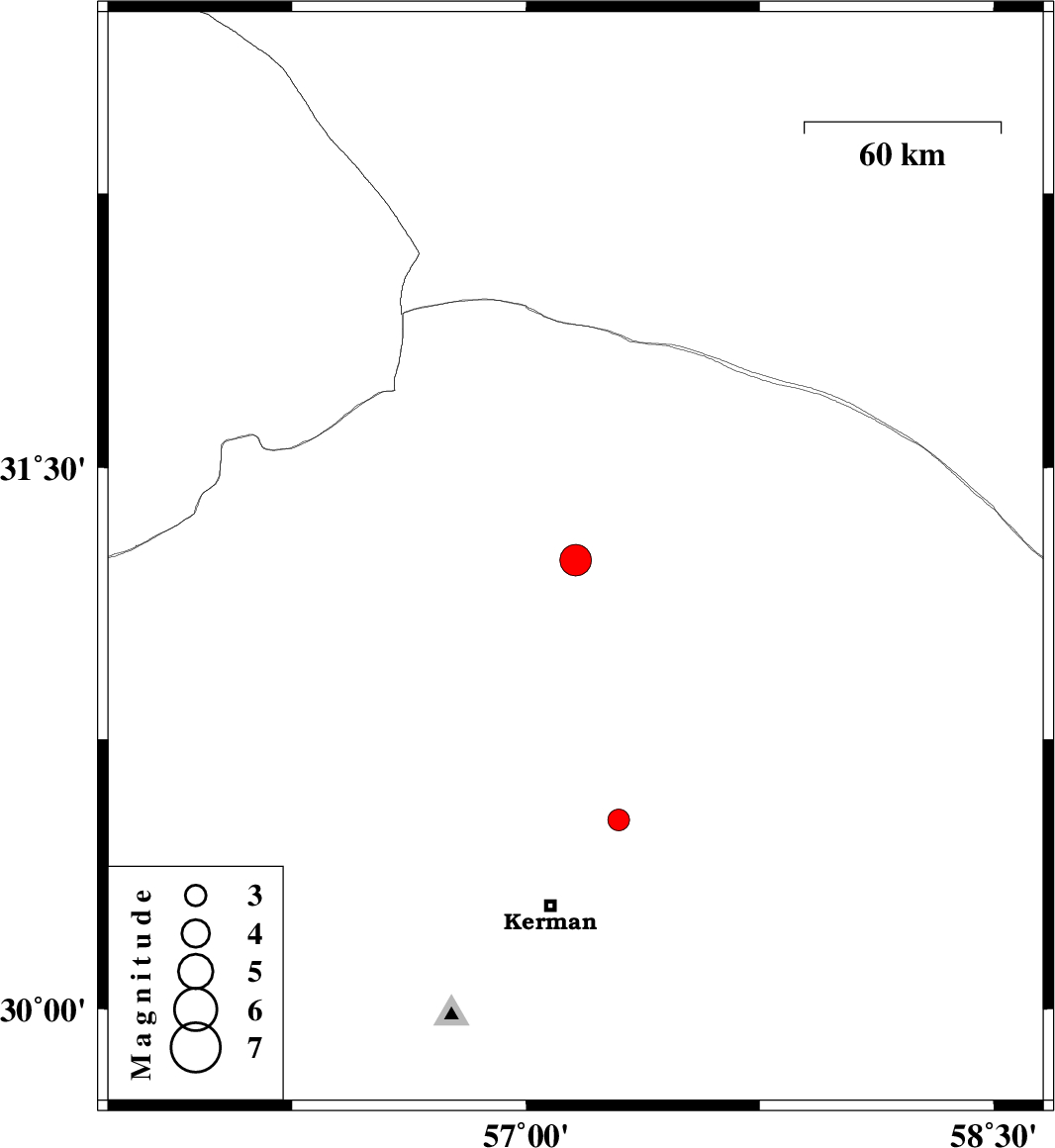 | 2017/05/08 | 16:35:32.2 | 21:05:32.2 | 30.526 | 57.298 | 14 | ML3.1 | Kerman Province, 34 km North-East of Kerman |