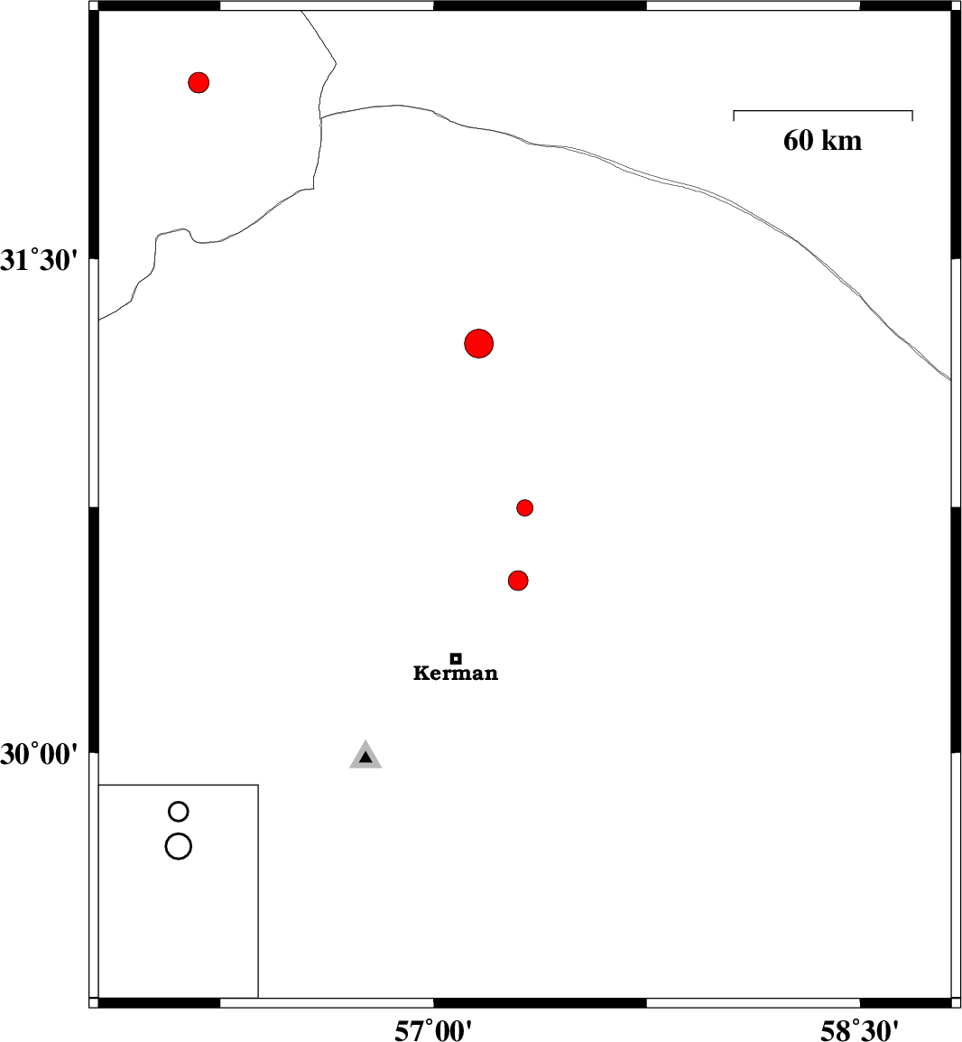 | 2017/05/13 | 04:57:47.2 | 09:27:47.2 | 30.746 | 57.321 | 14 | ML2.5 | Kerman Province, 56 km North-East of Kerman | ||
