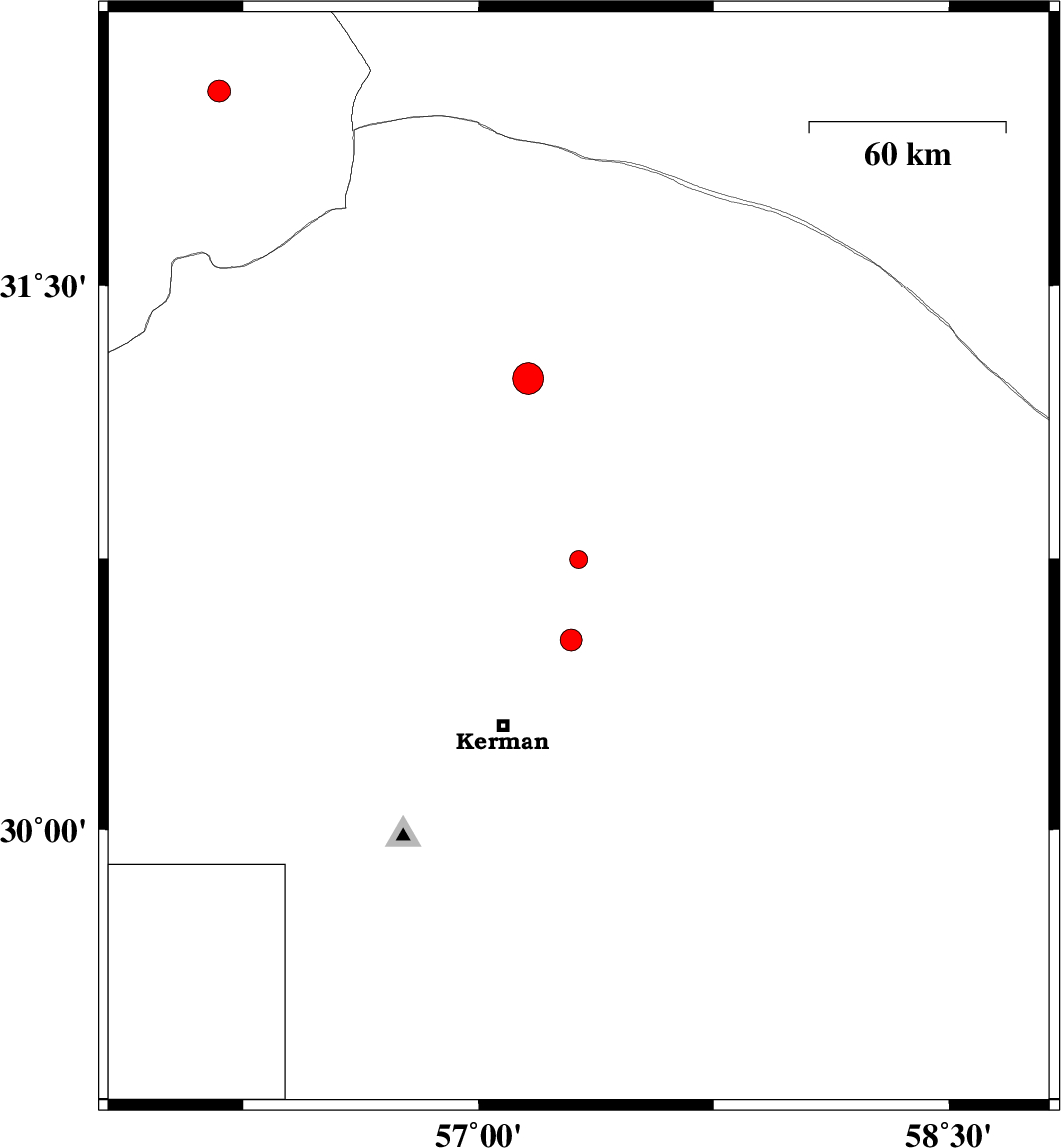 | 2017/05/08 | 16:35:32.2 | 21:05:32.2 | 30.526 | 57.298 | 14 | ML3.1 | Kerman Province, 34 km North-East of Kerman |