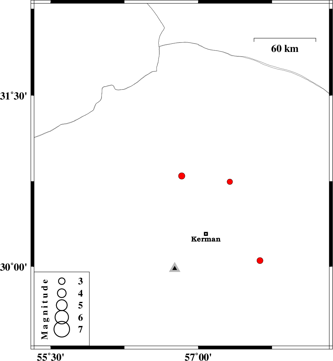 | 2017/05/13 | 04:57:47.2 | 09:27:47.2 | 30.746 | 57.321 | 14 | ML2.5 | Kerman Province, 56 km North-East of Kerman |