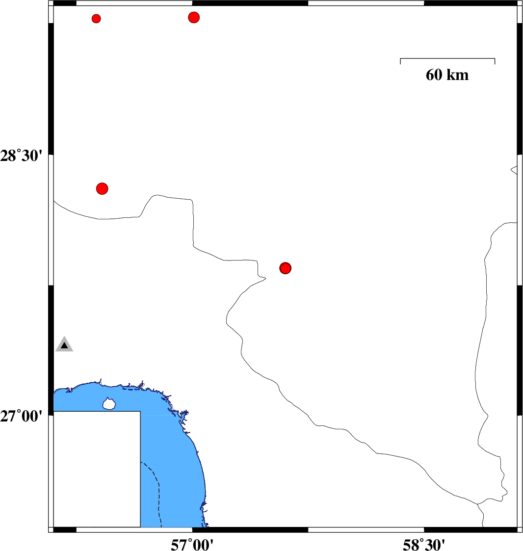 | 2017/05/19 | 05:29:10.7 | 09:59:10.7 | 27.846 | 57.604 | 14 | ML2.9 | Kerman Province, 15 km South of Kahnuj | ||