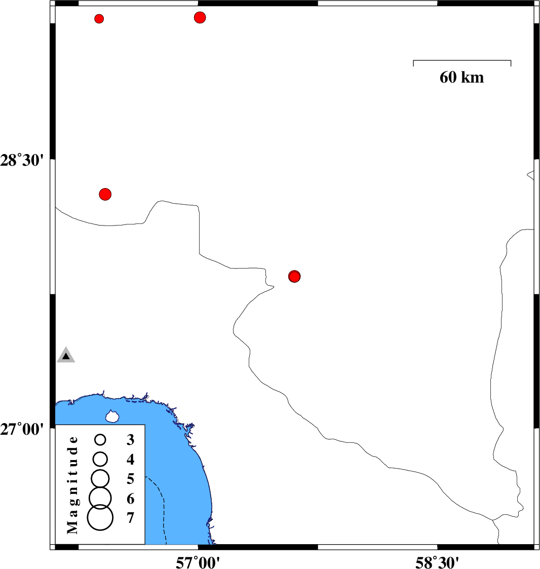 | 2017/05/19 | 05:29:10.7 | 09:59:10.7 | 27.846 | 57.604 | 14 | ML2.9 | Kerman Province, 15 km South of Kahnuj | ||