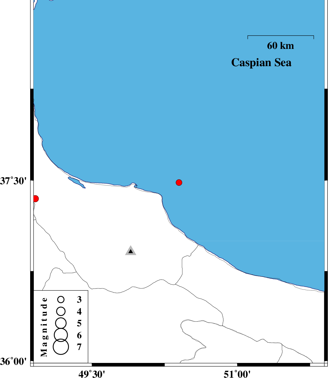 | 2017/05/30 | 10:16:05.9 | 14:46:05.9 | 37.482 | 50.398 | 14 | ML2.8 | Caspian Sea, 40 km North-East of Rudsar | ||