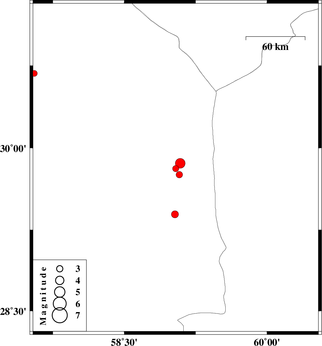 | 2017/06/10 | 04:07:03.4 | 08:37:03.4 | 29.86 | 59.089 | 14 | ML4.7 | Kerman Province, 110 km North-East of Bam | ||