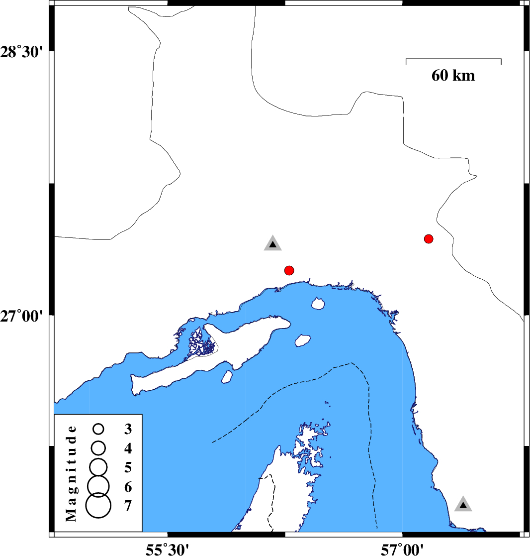 | 2017/06/25 | 03:41:42.8 | 08:11:42.8 | 27.255 | 56.276 | 16 | ML2.7 | Hormozgan Province, 8 km of Bandar-e abbas | ||