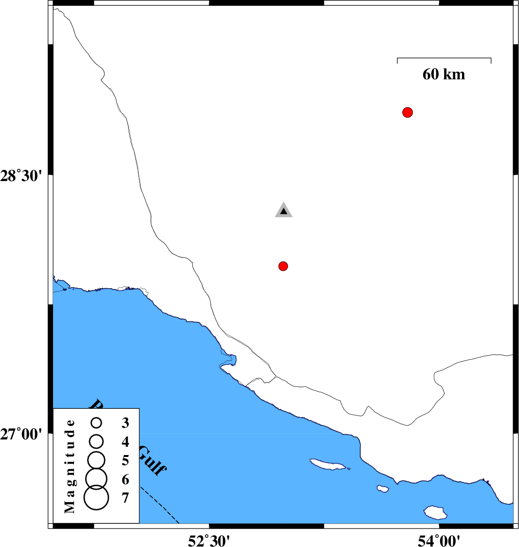 | 2017/06/25 | 02:30:07.2 | 07:00:07.2 | 27.972 | 52.983 | 14 | ML2.7 | Fars Province, 48 km North of Mehr | ||