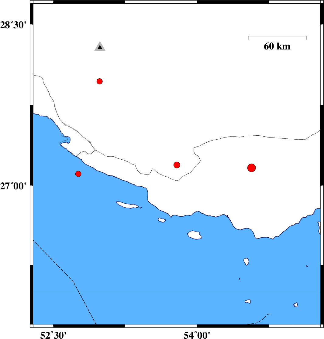 | 2017/06/25 | 02:30:07.2 | 07:00:07.2 | 27.972 | 52.983 | 14 | ML2.7 | Fars Province, 48 km North of Mehr | ||