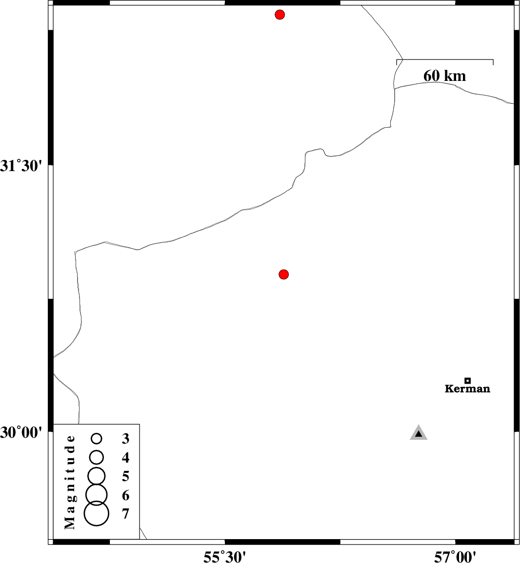 | 2017/06/30 | 14:10:52.9 | 18:40:52.9 | 30.887 | 55.882 | 14 | ML2.8 | Kerman Province, 55 km North-West of Rafsanjan | ||