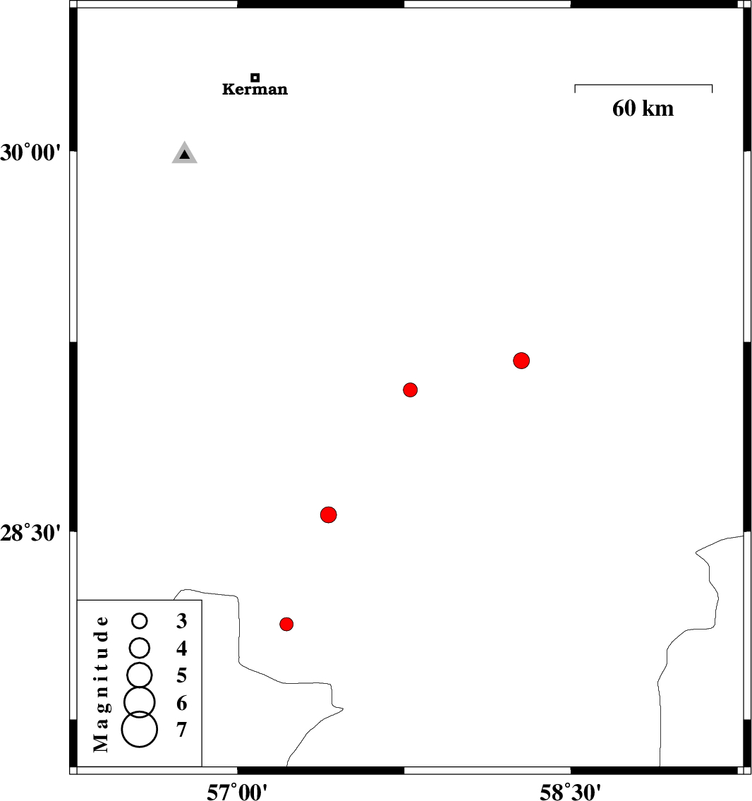 | 2017/06/26 | 01:35:10.3 | 06:05:10.3 | 28.565 | 57.409 | 17 | ML3.2 | Kerman Province, 34 km South-West of Jiroft |