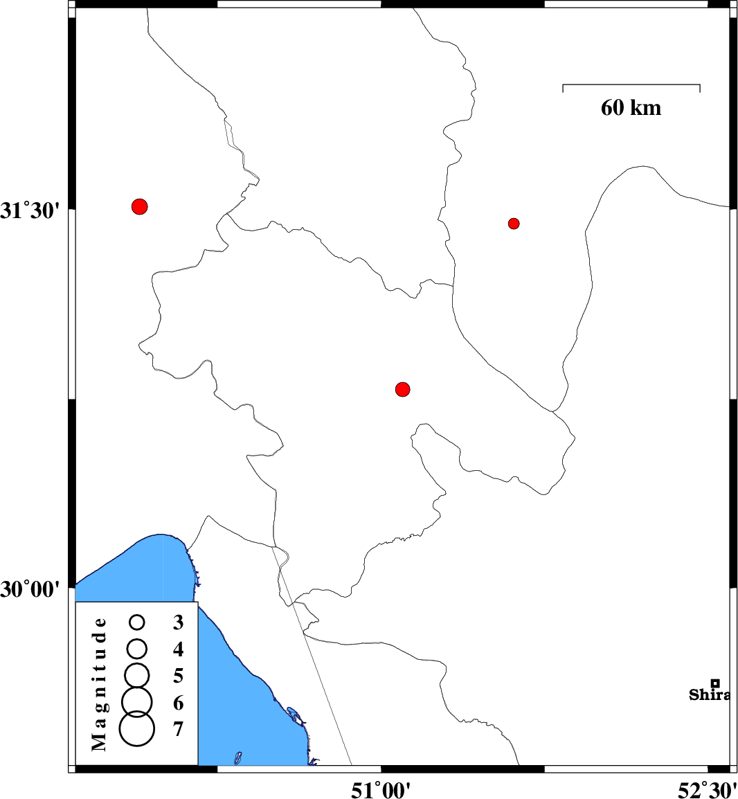 | 2017/07/02 | 01:08:54.6 | 05:38:54.6 | 30.789 | 51.099 | 14 | ML2.9 | Kohkiluieh va boyerahmad Province, 35 km -West of Sisakht | ||