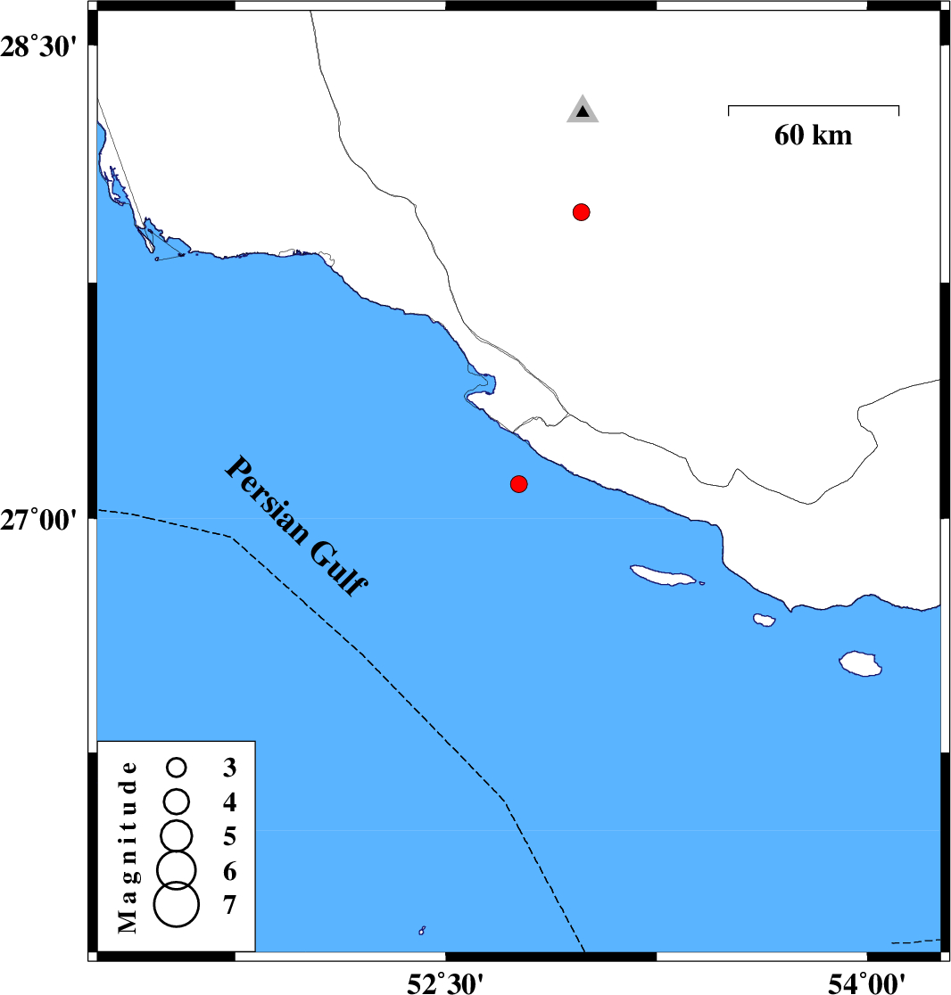 | 2017/06/25 | 02:30:07.2 | 07:00:07.2 | 27.972 | 52.983 | 14 | ML2.7 | Fars Province, 48 km North of Mehr |