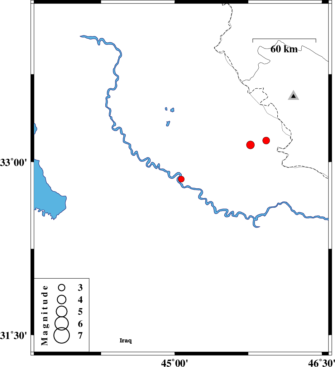 | 2017/07/03 | 23:47:21.8 | 04:17:21.8 | 32.852 | 45.067 | 6 | ML2.8 | Iraq, 83 km South-East of Bagdad | ||