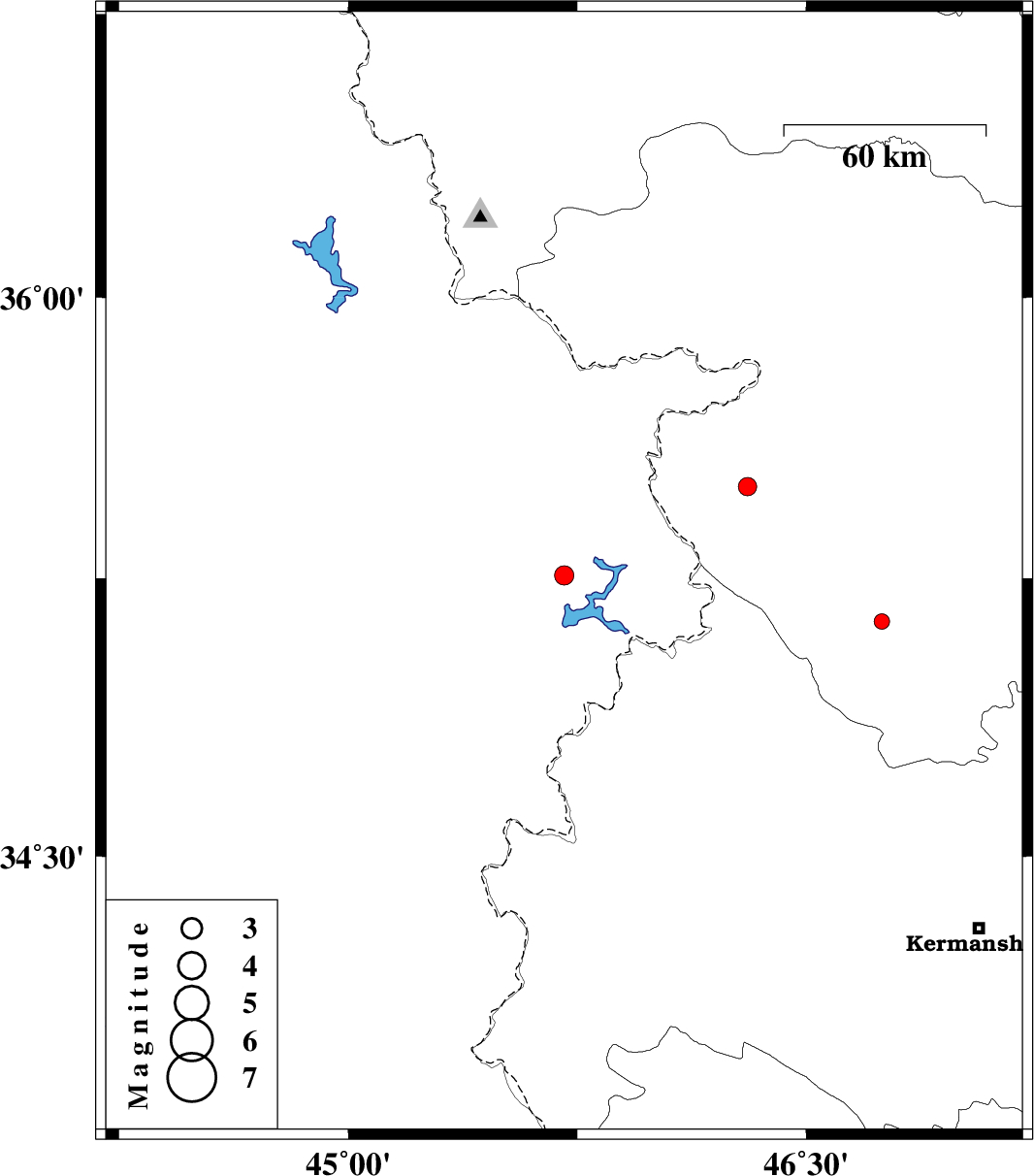 | 2017/06/19 | 01:47:46.1 | 06:17:46.1 | 35.133 | 46.747 | 7 | ML2.2 | Kurdistan Province, 31 km South-West of Sanandaj |