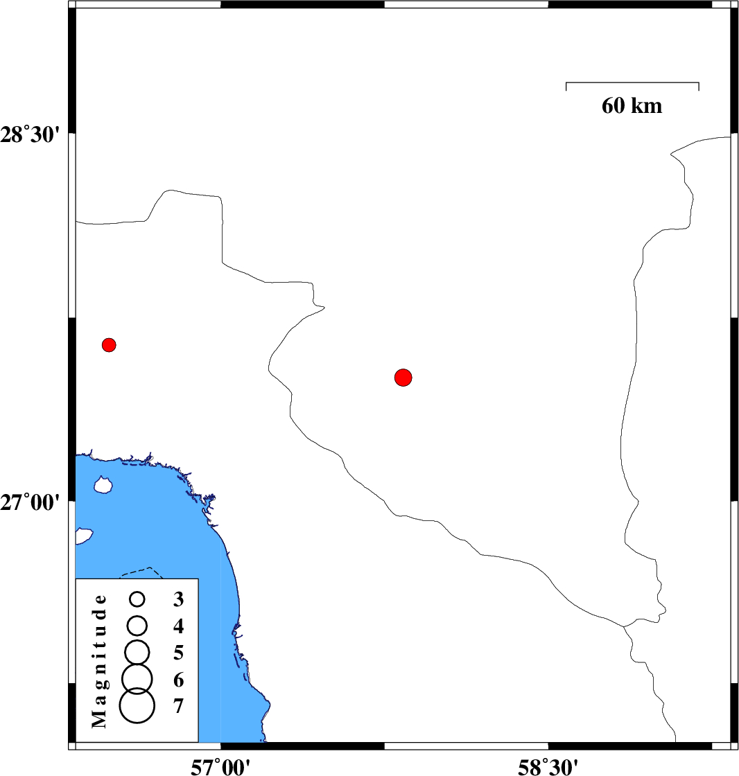 | 2017/06/02 | 18:57:21.5 | 23:27:21.5 | 27.638 | 56.488 | 14 | ML2.8 | Hormozgan Province, 54 km North-East of Bandar-e abbas |