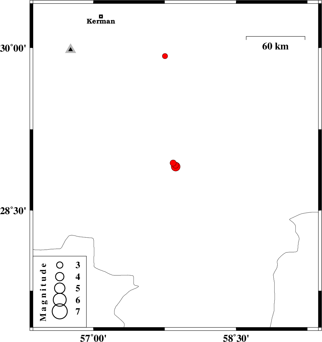| 2017/07/15 | 18:22:14.8 | 22:52:14.8 | 28.92 | 57.863 | 14 | ML2.9 | Kerman Province, 30 km North-East of Jiroft | ||