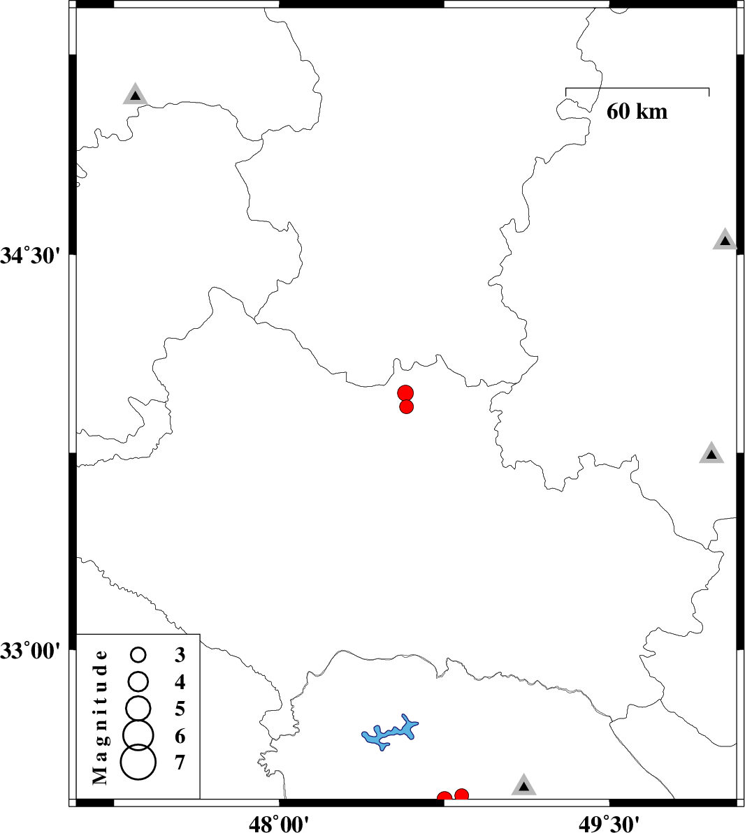 | 2017/07/23 | 08:03:19.5 | 12:33:19.5 | 33.925 | 48.578 | 15 | ML2.8 | Lorestan Province, 17 km -West of Borujerd | ||