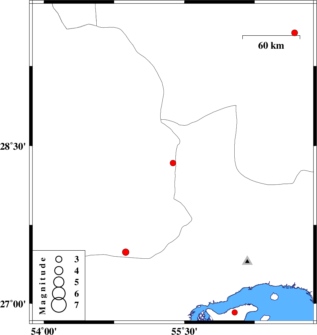 | 2017/07/19 | 22:06:43.5 | 02:36:43.5 | 26.914 | 56.037 | 12 | ML2.7 | Persian Gulf, 23 km -West of Qeshm |