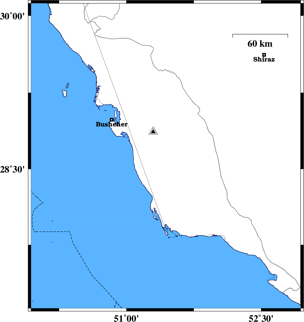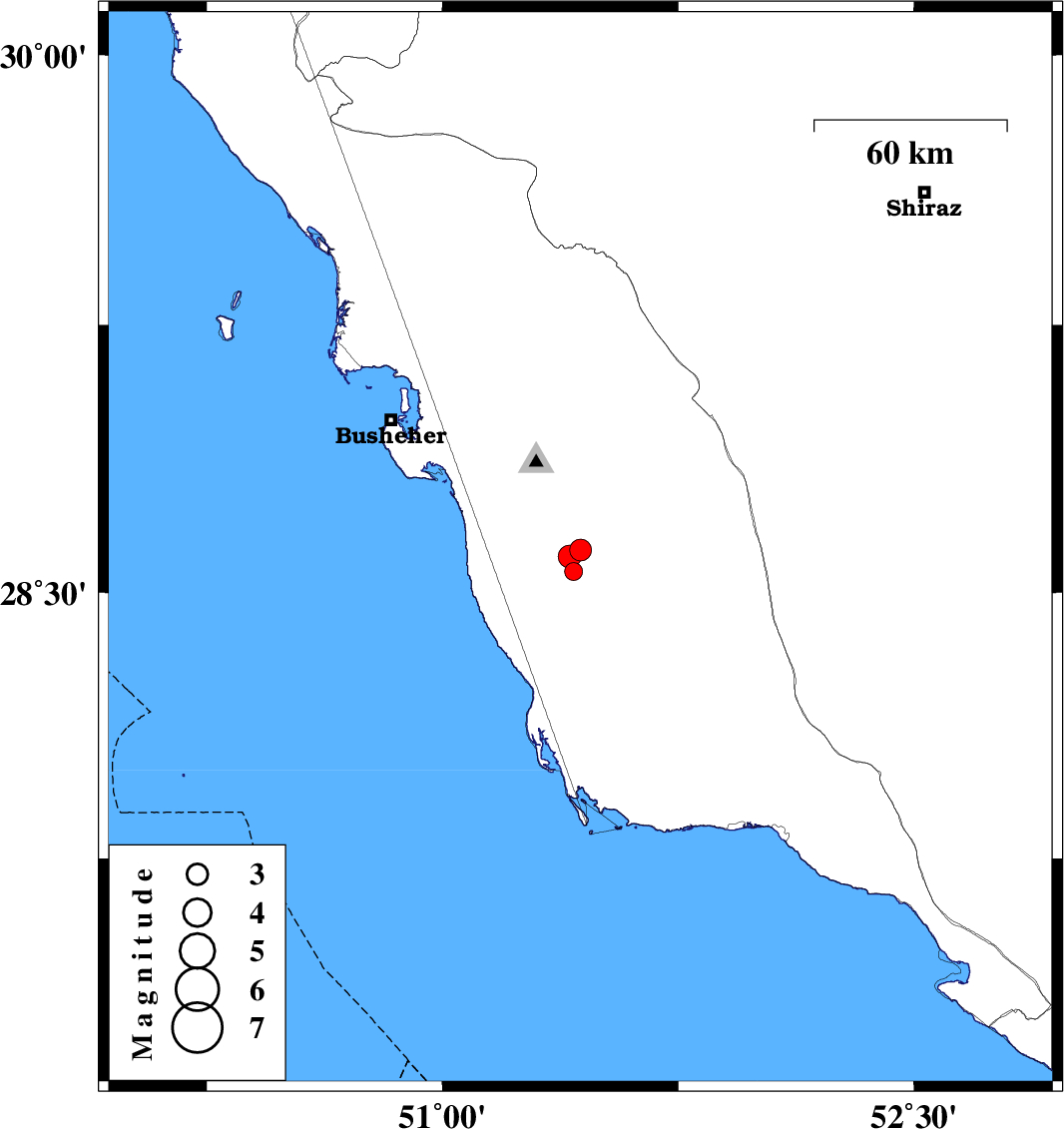 | 2017/07/29 | 14:29:56.1 | 18:59:56.1 | 28.559 | 51.417 | 15 | ML2.6 | Bushehr Province, 11 km of Khormog | ||